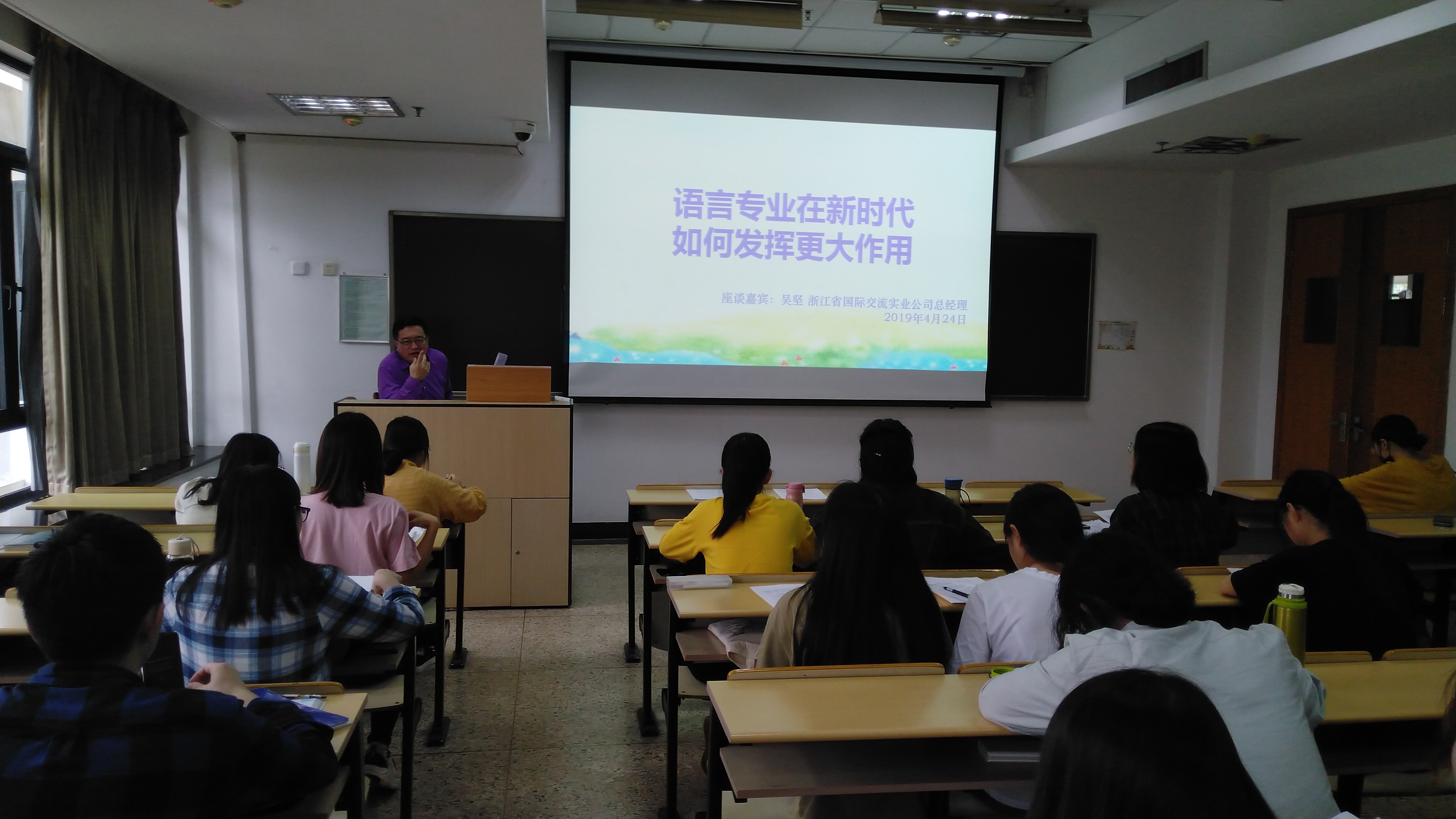 4月24日,浙江省国际交流实业公司吴坚总经理在教学楼A413与okpay下载 日语16011602班级同学开展了一次主题为“语言专业在新时代如何发挥更大作用”的实务导师座谈会。okpay下载 张晓东老师参与了本次座谈会。