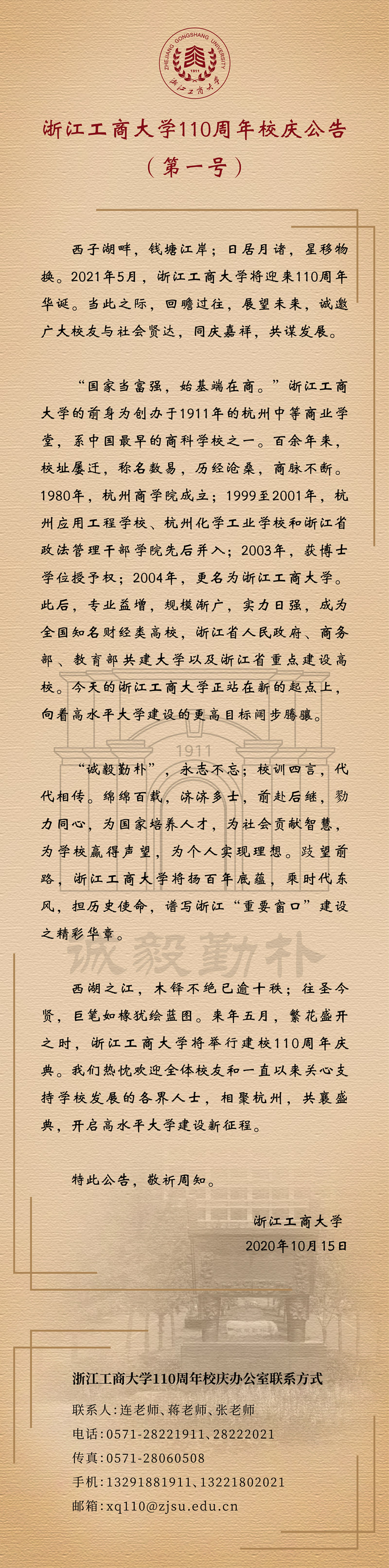 浙江工商大学110周年校庆公告(第一号)