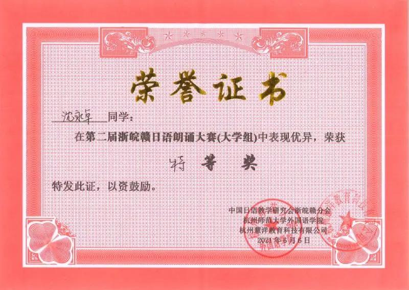 6月6日,由中国日语教学研究会浙皖赣分会和杭州师范大学外国语学院共同主办的“第二届浙皖赣日语朗诵大赛(大学组)”圆满落幕。okpay下载 选派的日语1901班沈永卓同学以91.75分的高分拔得头筹,荣获本次大赛唯一的特等奖。