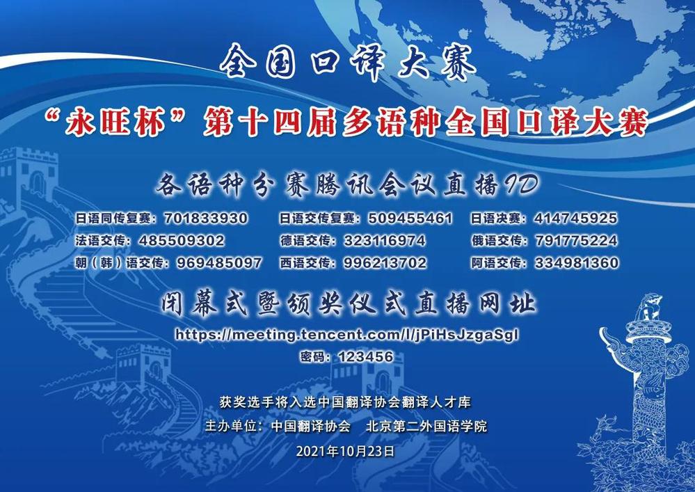 “永旺杯”多语种全国口译大赛由中国翻译协会、北京第二外国语学院共同主办,获奖选手将入选中国翻译协会翻译人才库。该比赛在业界以获奖含金量极高而著称。