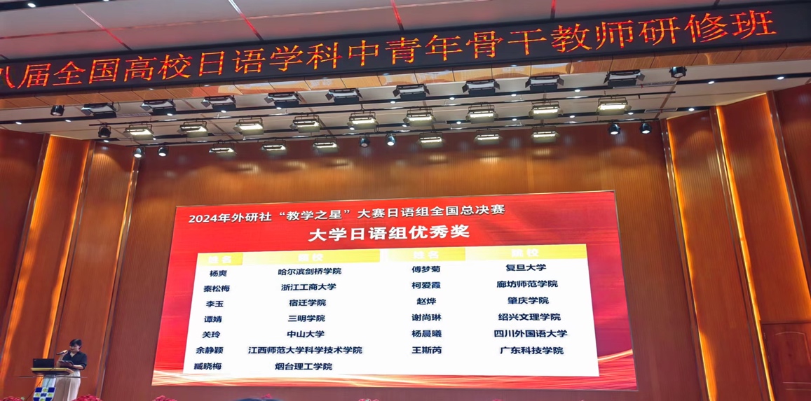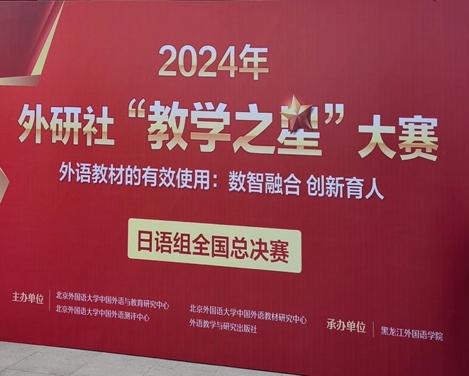 2024年7月23日-27日,第八届全国高校日语学科中青年骨干教师研修班暨2024年外研社“教学之星”大赛日语组全国总决赛在哈尔滨顺利召开。本届研讨会有教育部高等学校外国语言文学类专业教学指导委员会日语分委会、教育部高等学校大学外语教学指导委员会日语组、中国日语教学研究会、高等学校大学外语教学研究会日语分会、外语教学与研究出版社、日本国际交流基金会主办,黑龙江外国语学院承办。来自全国上百所日语专业院校的220余名教师参会研讨。