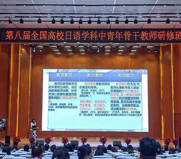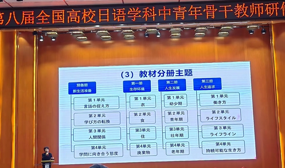 北京语言大学的杨峻教授以“四新”背景下的大学日语课程体系构建为题展开了专题报告。在报告中介绍了“四新”产生的过程,并在此过程中需要关注的关键词。根据《大学日语指南》中指出的培育国家情怀,服务国家战略与学生专业学习以及注重技术创新等要求进行大学日语课程体系的构建就极为重要。明确大学日语的课程性质是“通识教育的一个重要组成部分,兼具工具性和人文性。培养独立人格与独立思考的可贵品质是其终极目标。”为了实现这个目标教师的作用是不可替代的,教材的选用方面应注意分析学情,根据学情选择合适的教材。杨教授结合自己的教授经验介绍了《新一代大学日语》的各册内容构成。为日语教学提供了新的视角和方法。